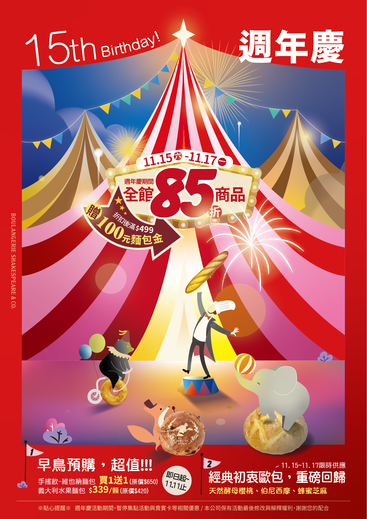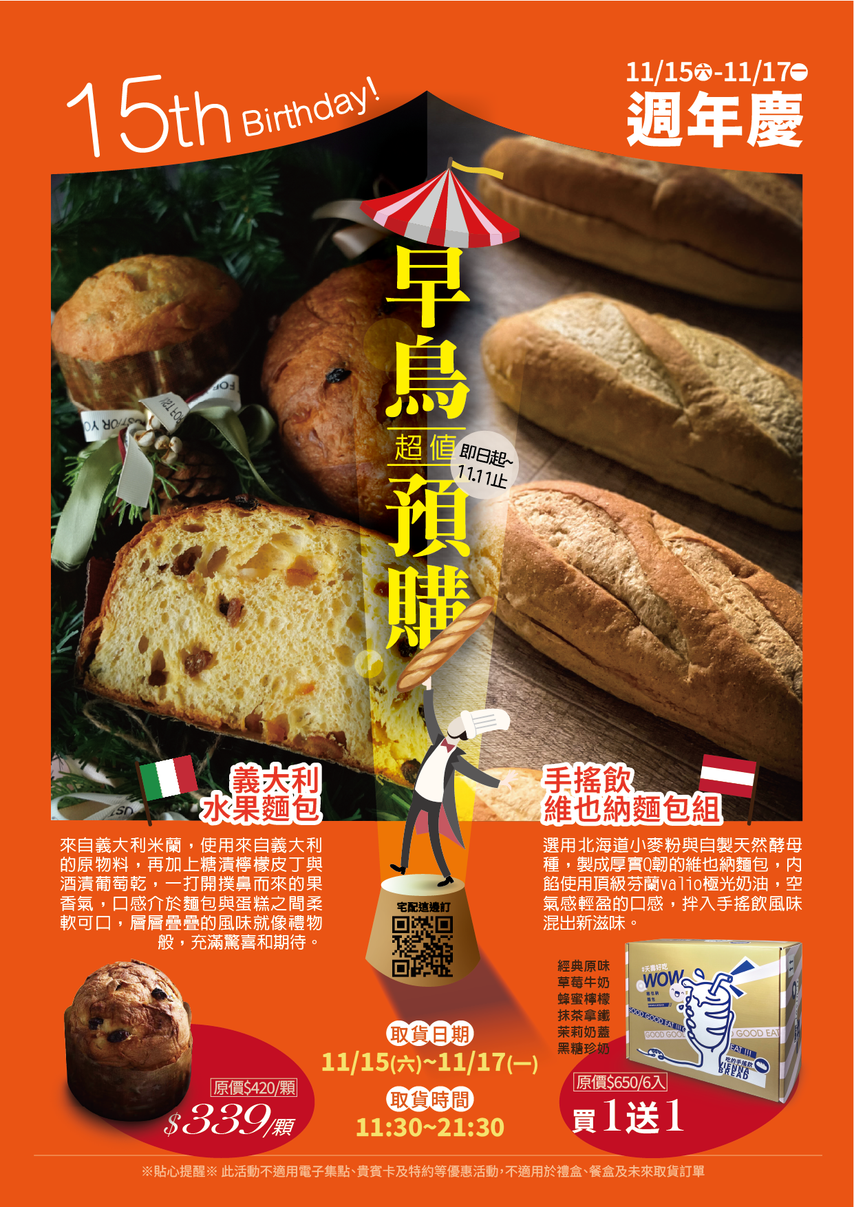※週年慶期間11/15-11/17,暫停麵包預訂。